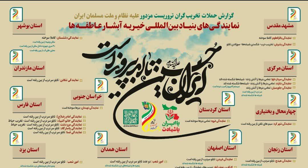 تعدادی از شعب خیریه آبشارعاطفهها که مکانی برای کمک به مردم نیازمند سراسر کشور است؛ در استانهای یزد، بوشهر، خراسان رضوی، همدان، مرکزی، لرستان، فارس و زنجان، توسط اغتشاشگران به آتش کشیده شده است.